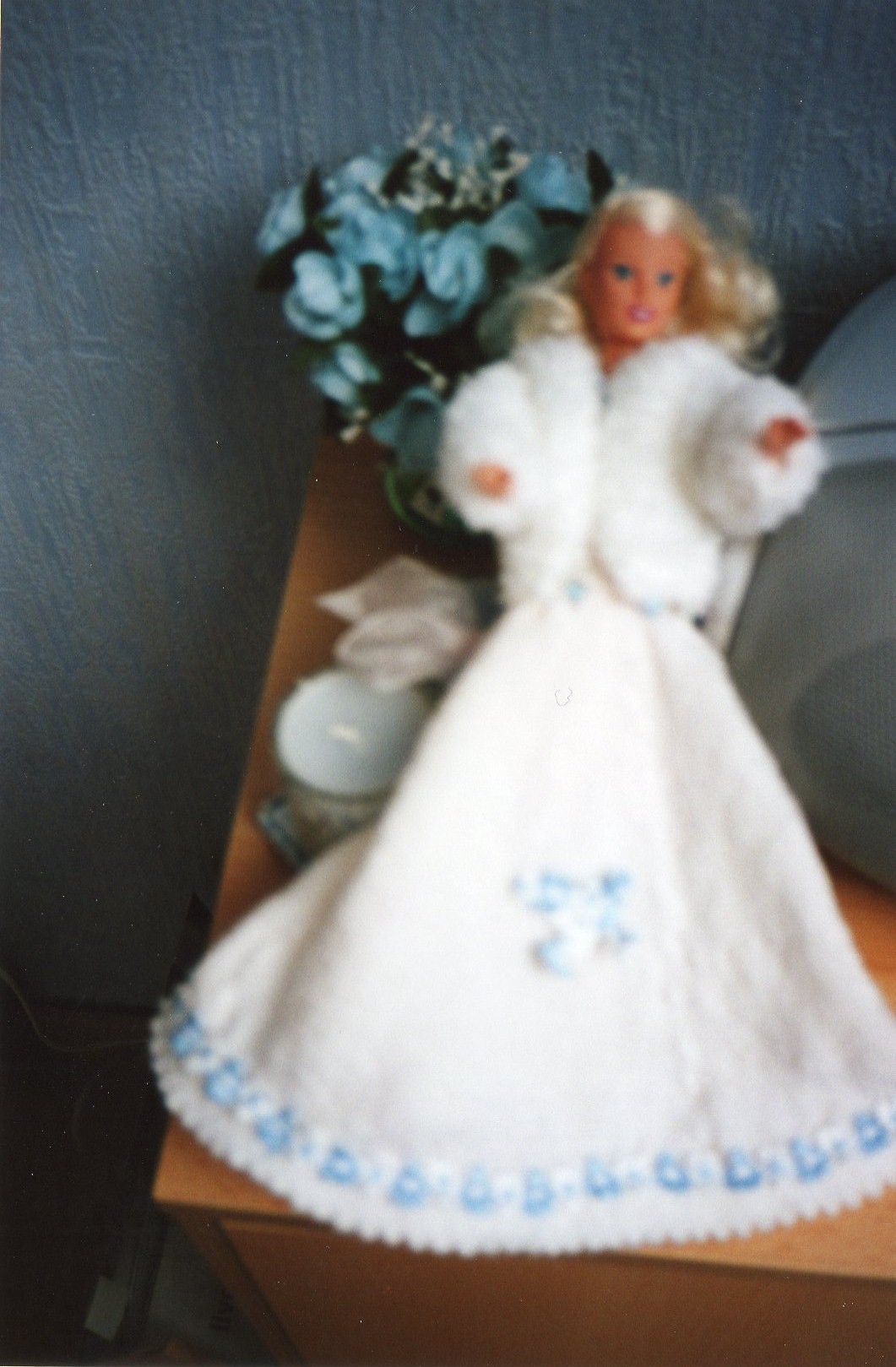 Robe blanche au tricot agrémentée de galon bleu et blanc avec une veste en laine fourrure blanche