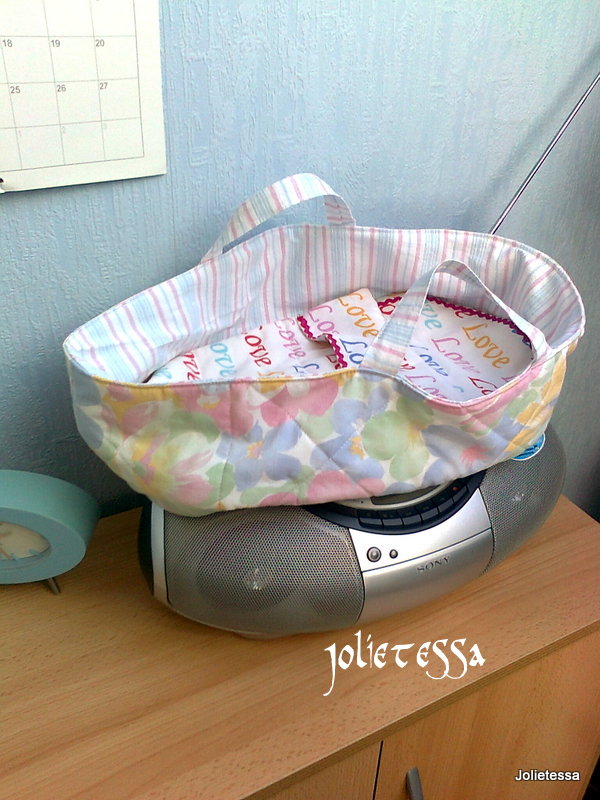 roman,times; font-size: large;">Un couffin tout ouatiné et matelassé et garni d'un matelas, d'un oreiller et d'une couette le tout quilté. Tout est fait avec du tissu de récupération