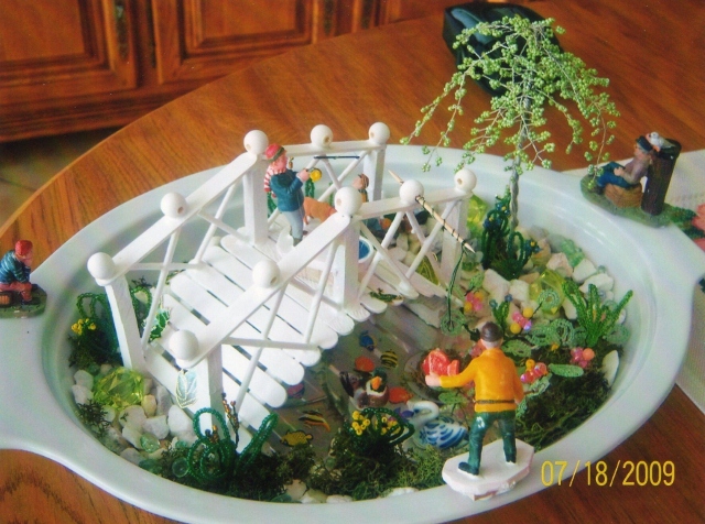 Mini Bassin Aquatique confectionné avec un saule pleureur, des Iris,Nénuphars en perles, un pont de bois fait avec des bâtonnets à esquimaux.